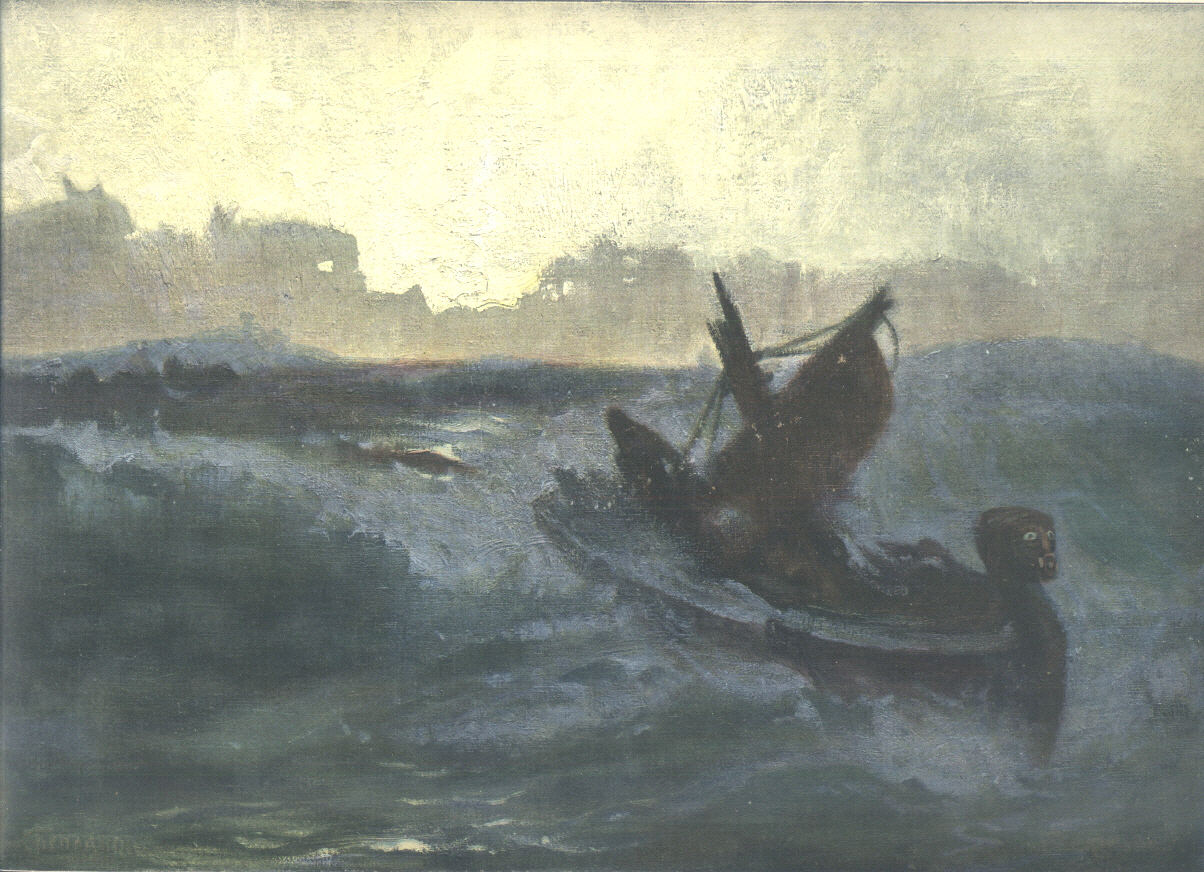 Ein Mitglied unseres Vereins hatte Erfolg und konnte dieses Gemälde im September 2022 erwerben. Es wurde in dem Auktionshaus als "Vikingerschiff" angeboten.