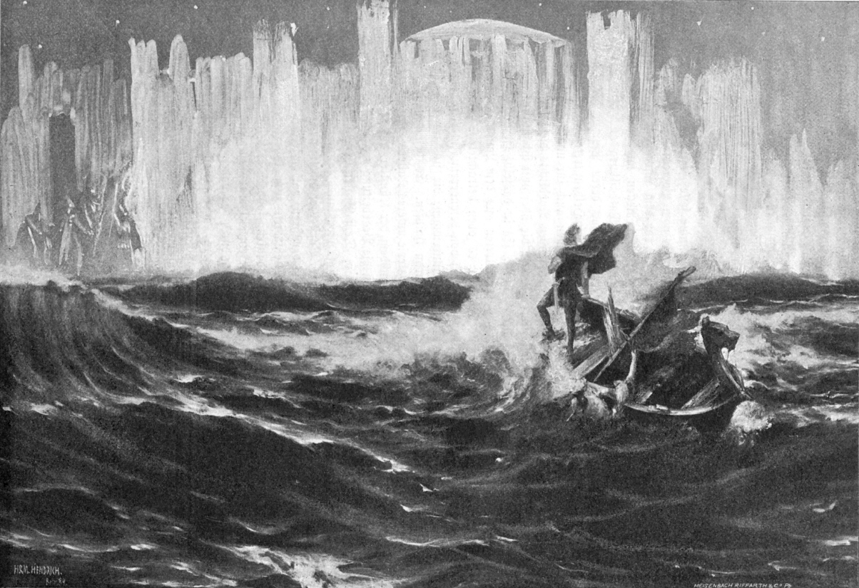 Atlantis - Diese Abbildung wurde in einem Heft aus dem 19. Jahrhundert im März 2005 dieses Jahres entdeckt . "Atlantis" war ein Auftragswerk von Kaiser Wilhem II. Detailfragen seitens des Kaisers führten jedoch zu einem Zerwürfnis. Der Kaiser wollte einen Vollmond im Hintergrund haben, Hendrich entgegnete ihm, dass es keinen Vollmond in Verbindung mit Nordlichtern geben würde. |