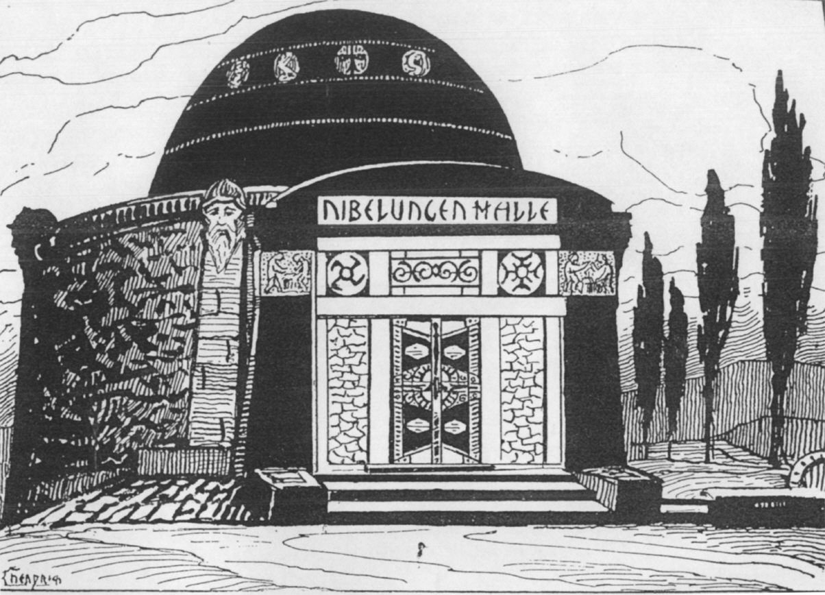Nibelungenhalle (Holzschnitt) - Diese Abbildung eines Hendrich Holzschnittes stammt aus dem Heft "Unsere Landschaft in der deutschen Kunst - Die Maler des Südharzes und seiner Vorlande". Endeckt: Ende Mai 2005. |