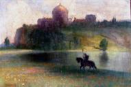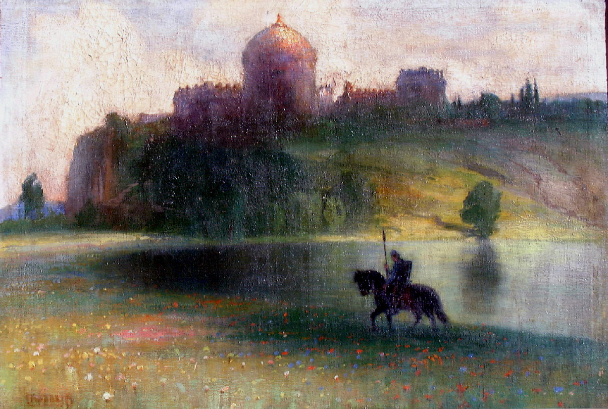 Parsifal erblickt die Gralsburg - Dieses vermutlich späte Ölgemälde befindet sich heute in Polen in Privatbesitz. Die hier vorliegende Abbildung wurde uns Anfang Januar 2006 zu Verfügung gestellt. Es ist das erste Gemälde der Sagenhalle was bis lang wieder entdeckt wurde. |